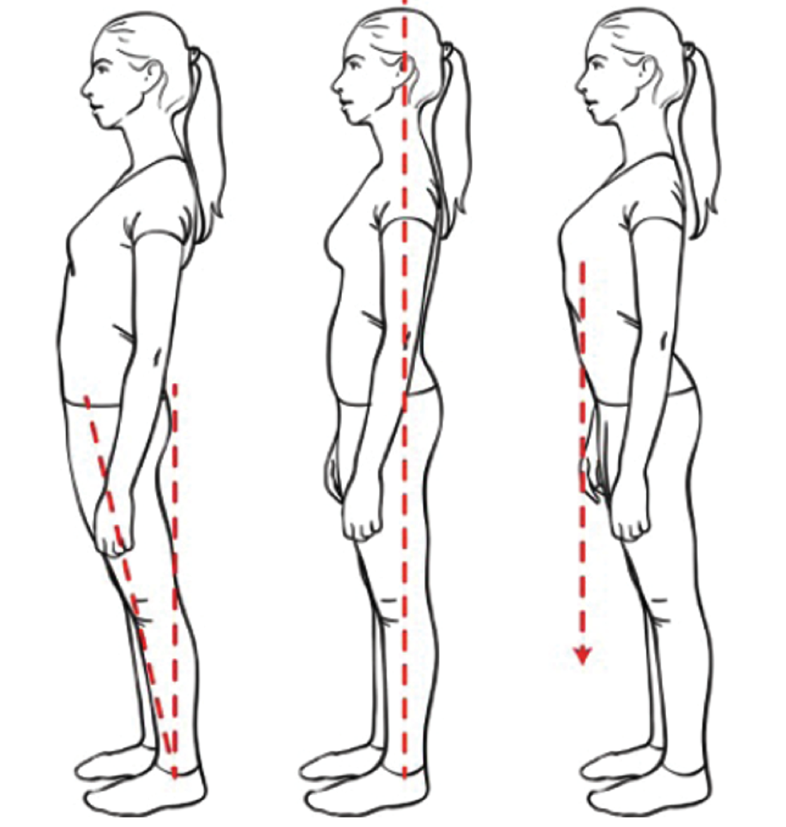 In the image of the right she is showing what we call a lordosis, or anterior tilt of the pelvis. Often we may try to address this by tucking the pelvis under but what I LOVE about this picture is that the arrow is showing us that often what we need to address is not the pelvis itself but the position of the ribcage. Quite often this posture is a bit of a hangover from pregnancy. If she can think of gently bringing her ribcage into the back of her t.shirt this may help her find the more aligned posture of the central image.
